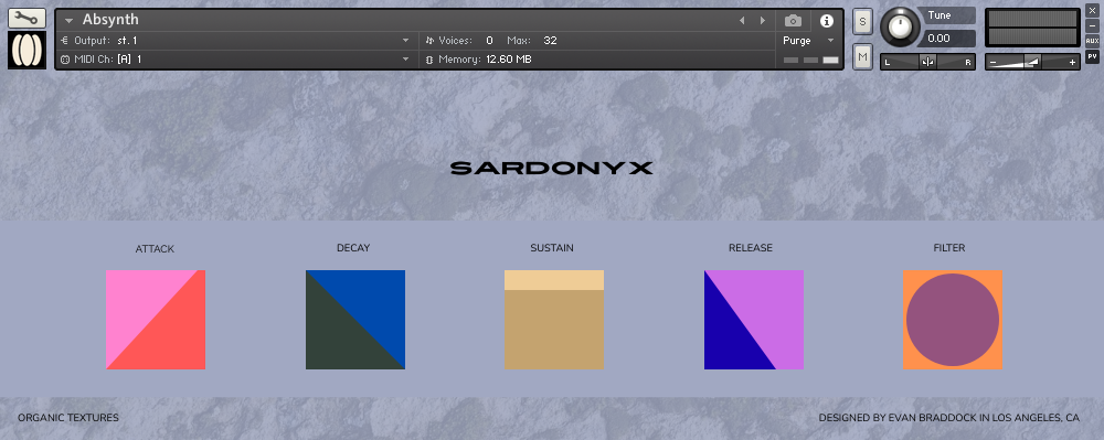 The UI is simple, and straightforward. With only five controls, it is great for beginners and pros. The limited knobs promote a deeper understanding of the fundamentals of tweaking a plugin and yield more tasteful results. These Bauhaus style sliders are layered over a rock-like texture background. The title of the plugin, Sardonyx, is a gemstone known for is multilayered look and durability, the prominent characteristics of this library. Sardonyx has been used in the past by the Romans during battle and to seal wax stamp letters.